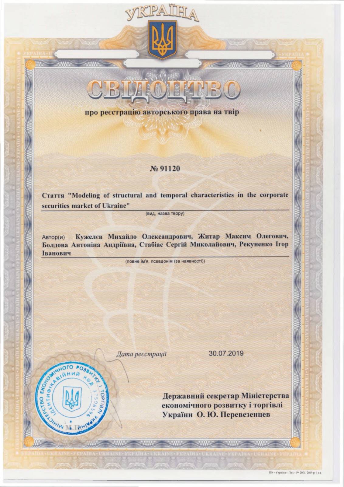 Свідоцтво про реєстрацію авторського права на твір №91120 стаття "Modeling of structural and temporal characteristics in the corporate securities market of Ukraine". Автори: Кужелєв Михайло Олександрович, Житар Максим Олегович, Болдова Антоніна Андріївна, Стабіас Сергій Миколайович, Рекуненко Ігор Іванович