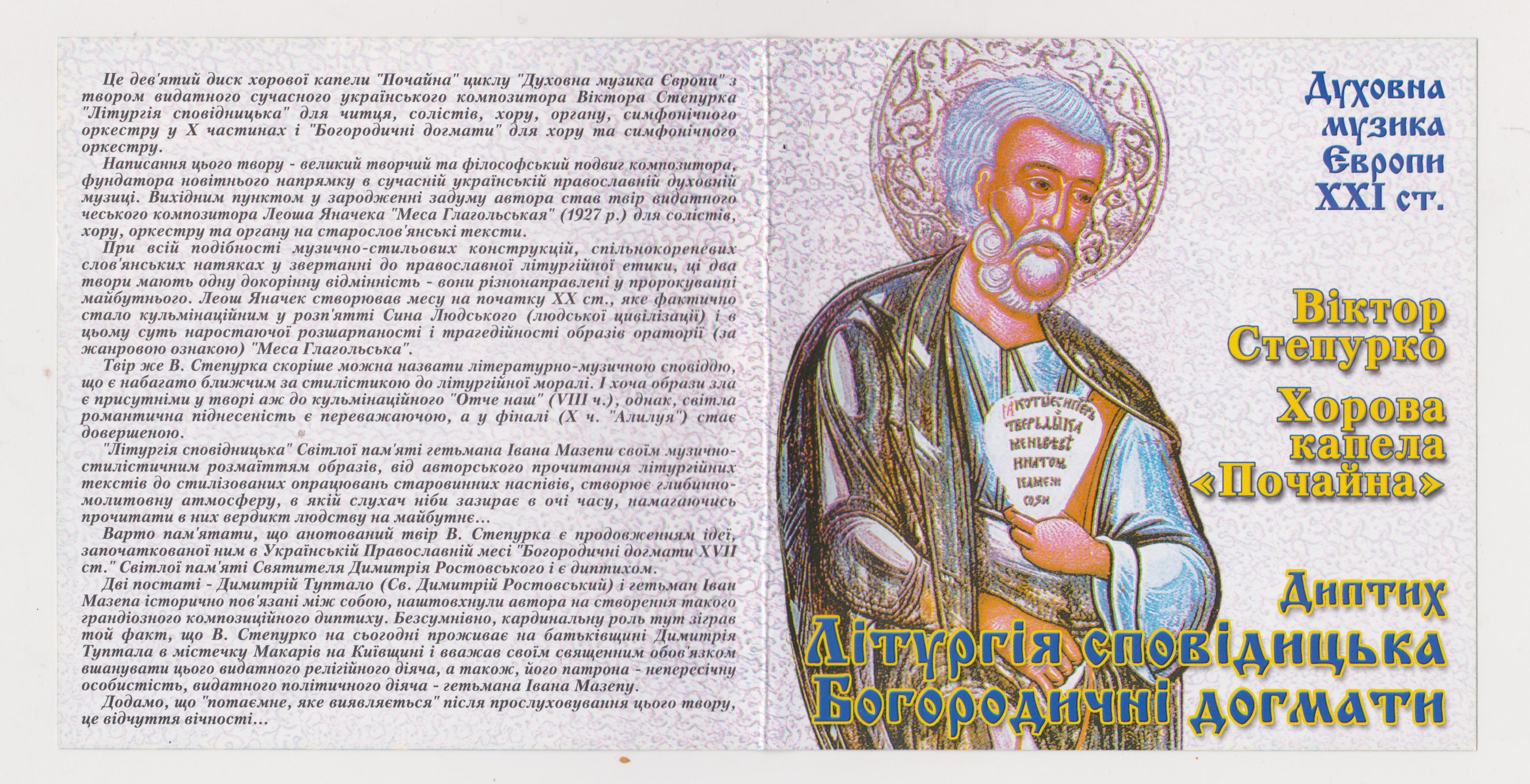 Це обкладинка до дев'ятого диску хорової капели "Почайна" циклу "Духовна музика Європи" з твором видатного сучасного українського композитора Віктора Степурка "Літургія сповідницька" для читця, солістів, хору, органу, симфонічного оркестру у X частинах і "Богородичні догмати" для хору та симфонічного оркестру.