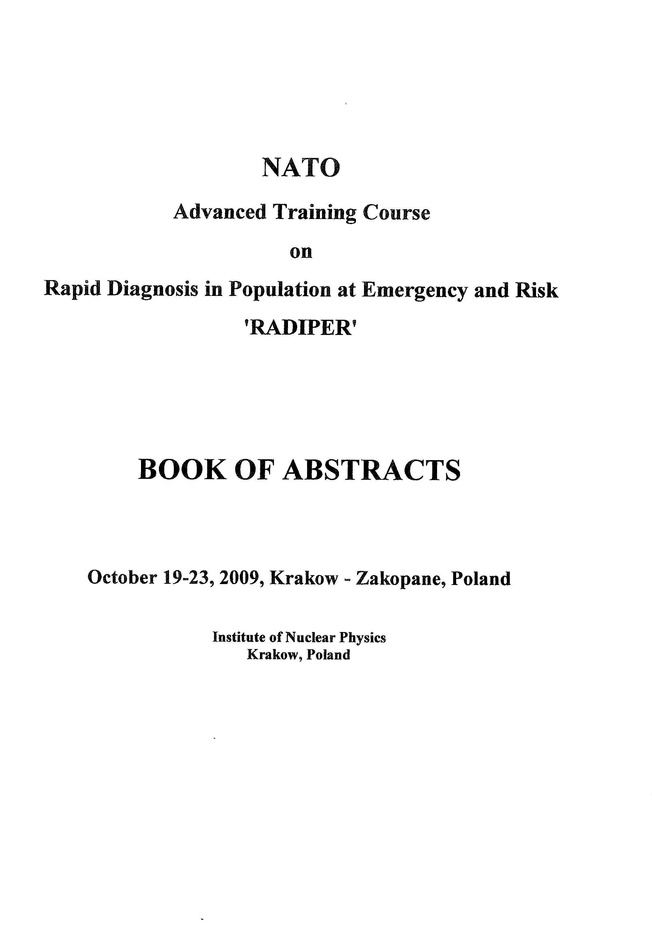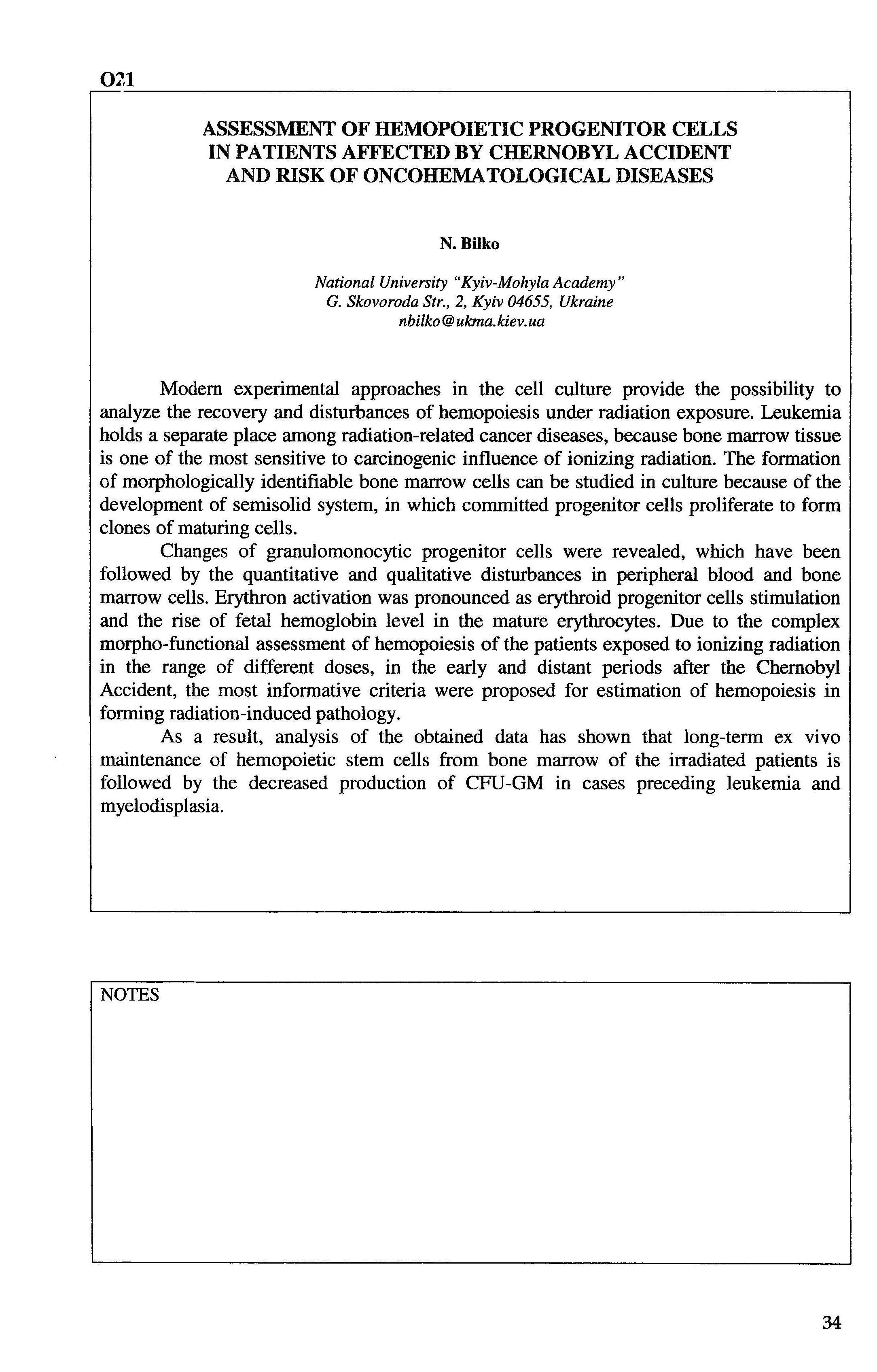 Bilko N. Assessment of hemopoietic progenitor cells in patients affected by Chernobyl accident and risk of oncohematological diseases / N. Bilko // NATO Advanced Training Course Rapid Diagnosis in Population at Emergency and Risk 'RADIPER': Book of Abstracts. - Krakow, 19-23 Oct 2009. – P. 34.