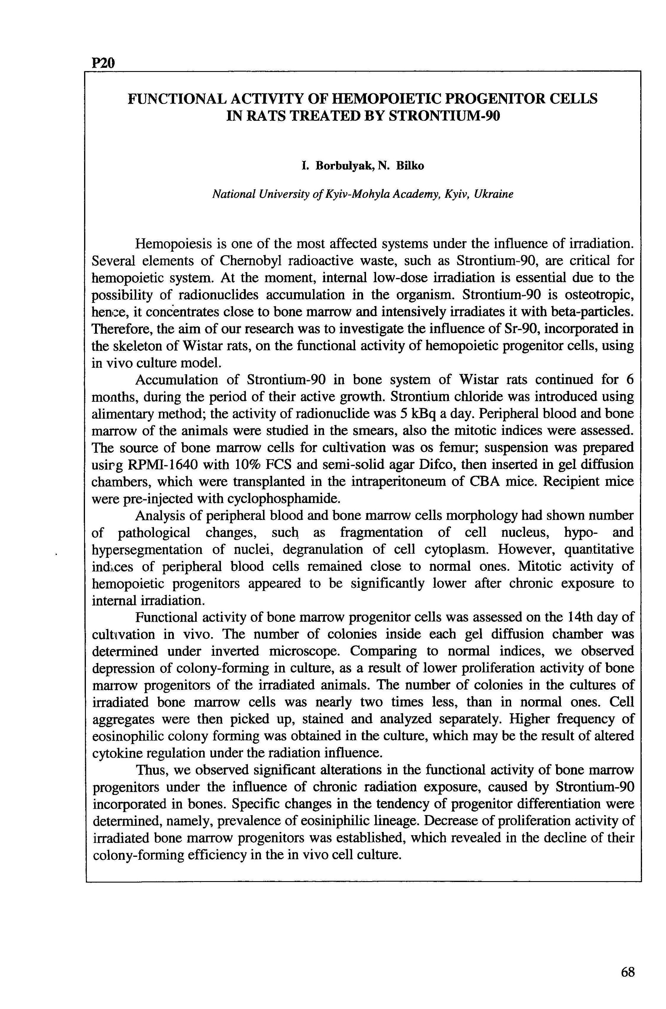 Borbulyak I. Functional activity of hemopoietic progenitor cells in rats treated by strontium-90 / I. Borbulyak, N. Bilko // NATO Advanced Training Course Rapid Diagnosis in Population at Emergency and Risk 'RADIPER': Book of Abstracts. - Krakow, 19-23 Oct 2009. – P. 68.